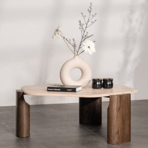 Materials: Polished travertine top with solid ash wood legs