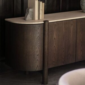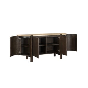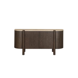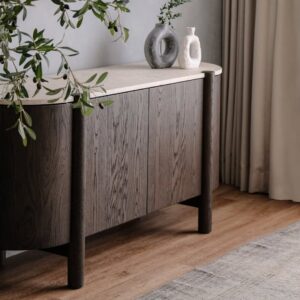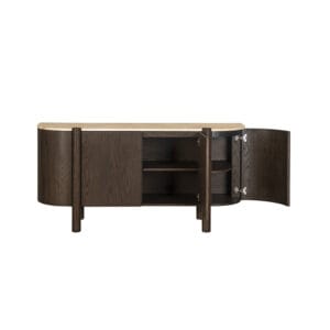 A gentle blend of strength and softness, the Macchiato Sideboard brings together dark-stained oak and a creamy travertine top, like coffee brushed with milk. Its curved lines and tactile wood grain offer a sense of calm, while the four doors open to generous storage for everything from dinnerware to quiet moments. Crafted to feel timeless yet warm, this piece invites balance, order, and a touch of everyday beauty into your home.